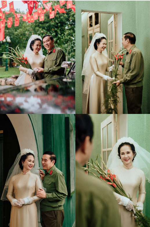 Vợ chồng NSND Lan Hương muốn tái hiện hình ảnh cặp đôi thuở xưa hạnh phúc trong ngày cưới sau khi đất nước hòa bình. Cô dâu mặc áo dài cưới mộc mạc, trên tay là bó hoa lay ơn giản dị, ánh mắt và nụ cười ánh lên niềm hạnh phúc.
